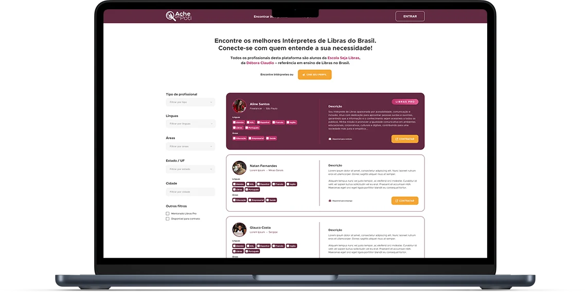 Conecte-se com oportunidades reais de interpretação em Libras através da plataforma exclusiva dos alunos Seja Libras. Cadastre-se e seja encontrado por empresas, igrejas, escolas e eventos que buscam intérpretes qualificados em todo o Brasil. Transforme seu aprendizado em carreira profissional.